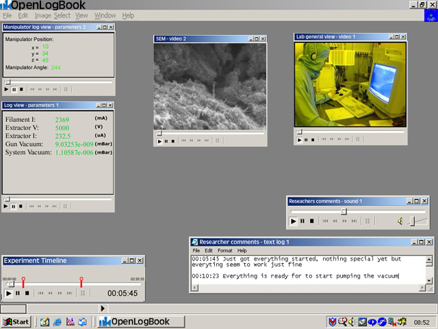 The first part of this example is same than the others, recording the data. In this example there is three primary data sources. One video camera, the operators microphone and the actual nanotechnology machinery including exhaust pumps etc. The nanotechnology equipment is controlled with a normal personal computer with special software. It is possible to record a lot of numerical data (like different voltage levels etc.). See picture 1 and 2 for examples of the recording set up.